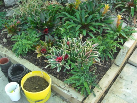 Having decided on the arrangement, I quickly noted it is quite tricky planting bromeliads in the small spaces between the existing serrated edged plants. I also discovered